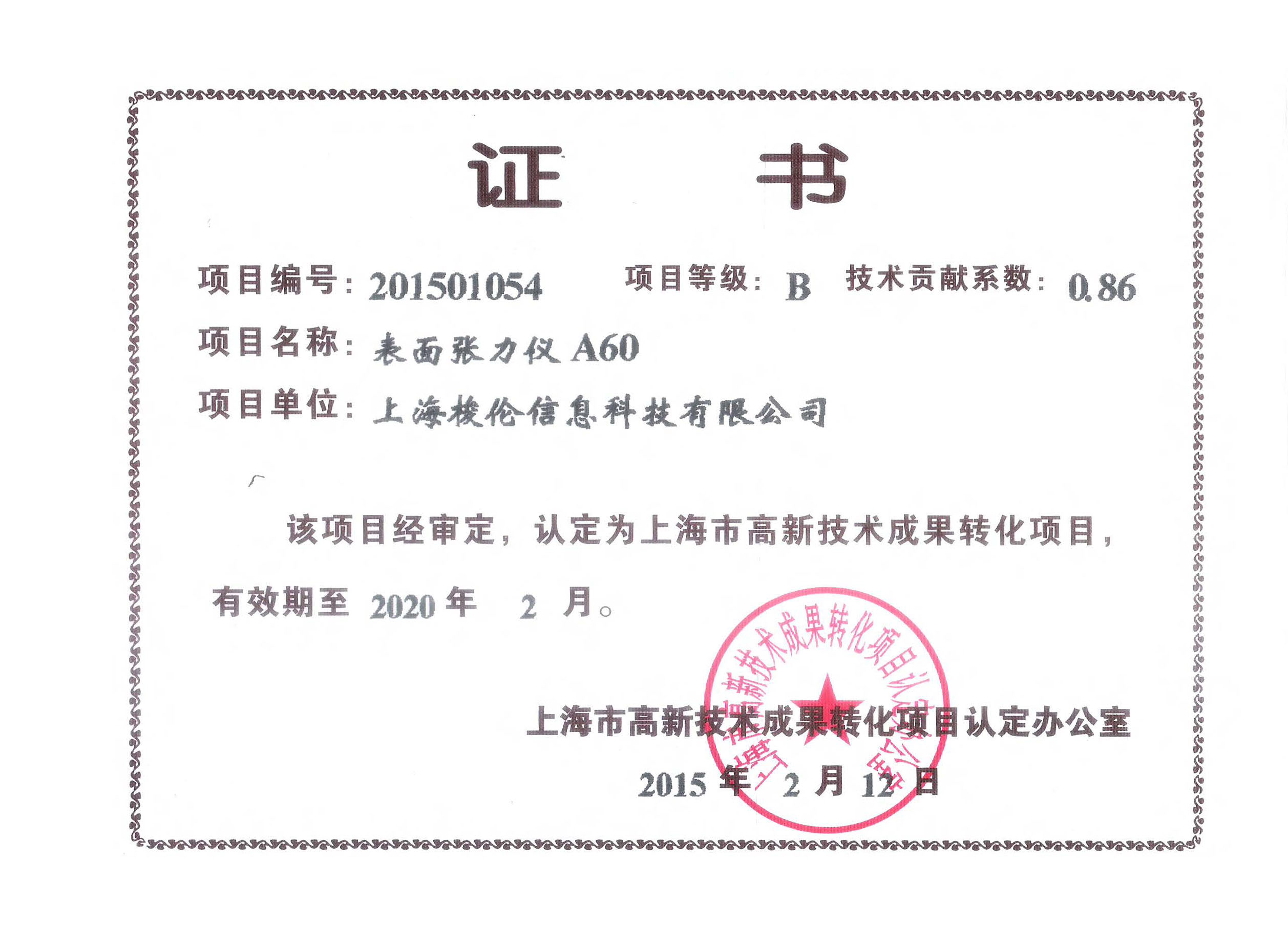 熱烈祝賀上海梭倫科技表面張力儀獲上海市高新成果轉(zhuǎn)化項目證書。這是國家權(quán)威機構(gòu)對我們技術(shù)以及產(chǎn)品的全面認可,也是上海梭倫的榮譽。 上海梭倫為美國科諾中國戰(zhàn)略投資公司,專業(yè)研制表面張力儀、界面張力儀和接觸角儀。目前,全系列產(chǎn)品均已經(jīng)獲得上海市高新成果轉(zhuǎn)化項目認證通過。界面張力儀TX500系列,接觸角儀SL200系列以及新通過的表面張力儀A60系列,全面采用了上海梭倫的各項專利技術(shù),從而為保證我們的技術(shù)先進性、產(chǎn)品創(chuàng)新性。 我們將加大研發(fā)投入,研制出更多符合用戶需求的,性價比高的產(chǎn)品。 2015年,新投入的產(chǎn)品包括了三液滴法接觸角和表面自由能分析模塊以及超高壓、高溫旋轉(zhuǎn)滴界面張力儀TX500HP。歡迎來電咨詢相關(guān)產(chǎn)品信息。